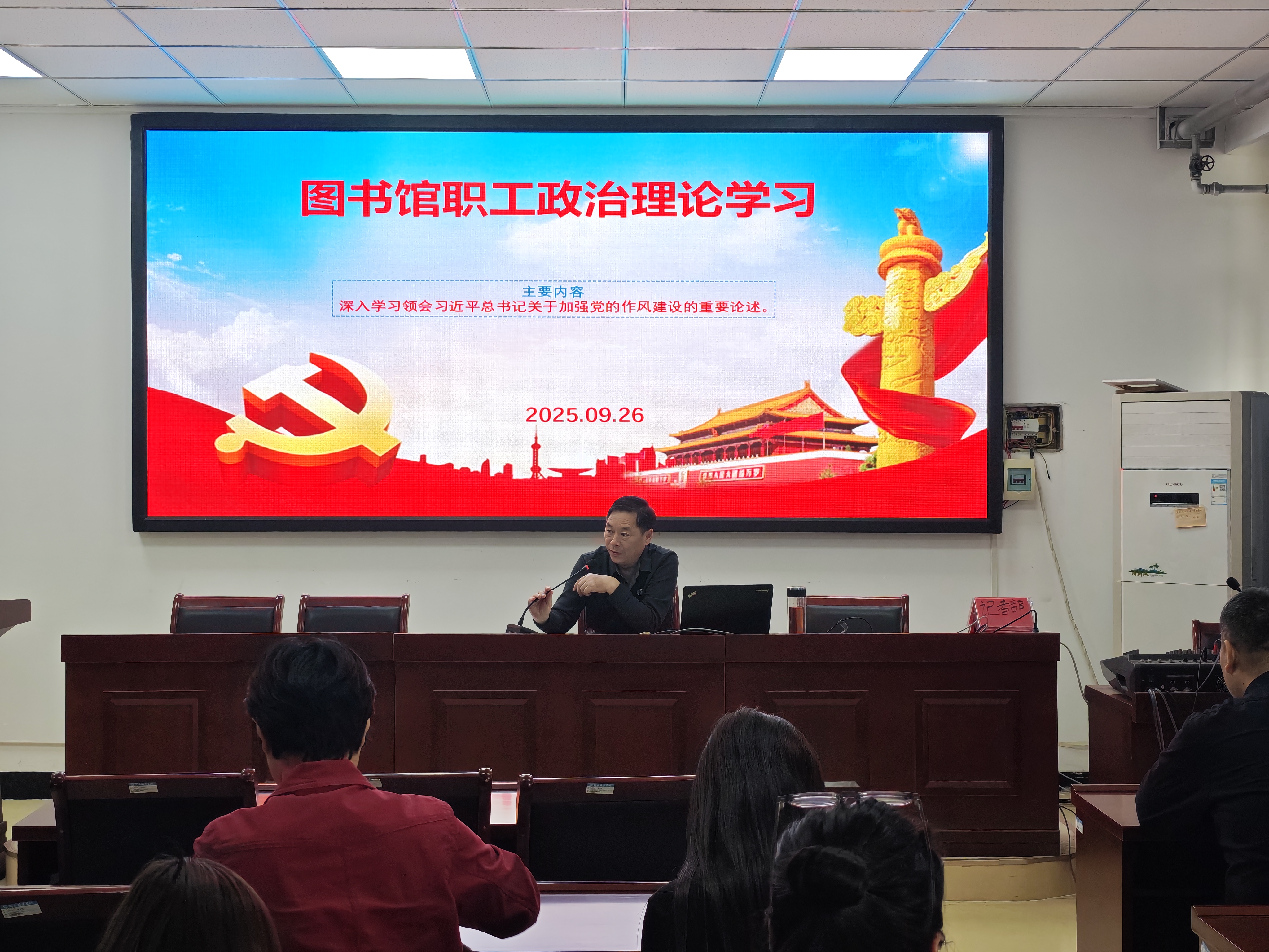 9月26日下午,图书馆举行职工政治理论学习,重点学习习近平总书记关于加强党的作风建设的重要论述。